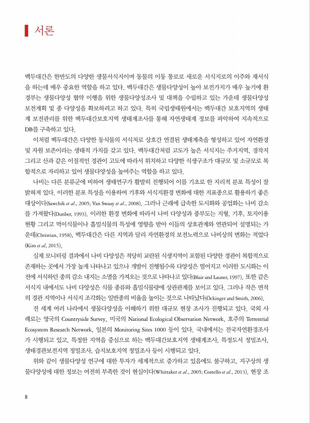 8 서론 백두대간은 한반도의 다양한 생물서식지이며 동물의 이동 통로로 새로운 서식지로의 이주와 재서식 을 하는데 매우 중요한 역할을 하고 있다. 백두대간은 생물다양성이 높아 보전가치가 매우 높기에 환 경부는 생물다양성 협약 이행을 위한 생물다양성조사 및 대책을 수립하고 있는 가운데 생물다양성 보전계획 및 종 다양성을 확보하려고 하고 있다. 특히 국립생태원에서는 백두대간 보호지역의 생태 계 보전관리를 위한 백두대간보호지역 생태계조사를 통해 자연생태계 정보를 파악하여 지속적으로 DB를 구축하고 있다. 이처럼 백두대간은 다양한 동식물의 서식처로 상호간 연결된 생태계축을 형성하고 있어 자연환경 및 자원 보존이라는 생태적 가치를 갖고 있다. 백두대간처럼 고도가 높은 서식지는 주거지역, 경작지 그리고 산과 같은 이질적...