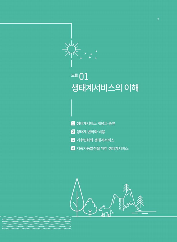 모듈01 생태계서비스의 이해 1 생태계서비스 개념과 종류 2 생태계 변화와 비용 3 기후변화와 생태계서비스 4 지속가능발전을 위한 생태계서비스7