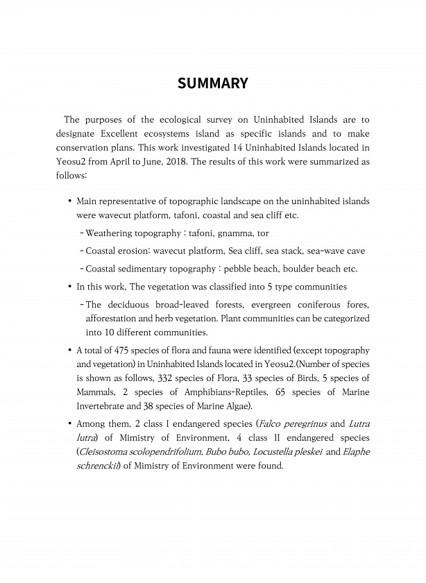 SUMMARY The purposes of the ecological survey on Uninhabited Islands are to designate Excellent ecosystems island as specific islands and to make conservation plans. This work investigated 14 Uninhabited Islands located in Yeosu2 from April to June, 2018. The results of this work were summarized as follows? Main representative of topographic landscape on the uninhabited islands were wavecut platfo...