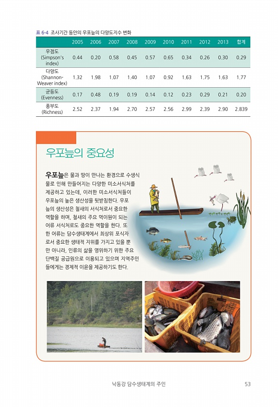 낙동강 담수생태계의 주인 53 우포늪은 물과 땅이 만나는 환경으로 수생식 물로 인해 만들어지는 다양한 미소서식처를 제공하고 있는데, 이러한 미소서식처들이 우포늪의 높은 생산성을 뒷받침한다. 우포 늪의 생산성은 철새의 서식처로서 중요한 역할을 하며, 철새의 주요 먹이원이 되는 어류 서식처로도 중요한 역할을 한다. 또 한 어류는 담수생태계에서 최상위 포식자 로서 중요한 생태적 지위를 가지고 있을 뿐 만 아니라, 인류의 삶을 영위하기 위한 주요 단백질 공급원으로 이용되고 있으며 지역주민 들에게는 경제적 이윤을 제공하기도 한다. 우포늪의 중요성 표 6-4 조사기간 동안의 우포늪의 다양도지수 변화 2005 2006 2007 2008 2009 2010 2011 2012 2013 합계 우점도 Simpsons index ...