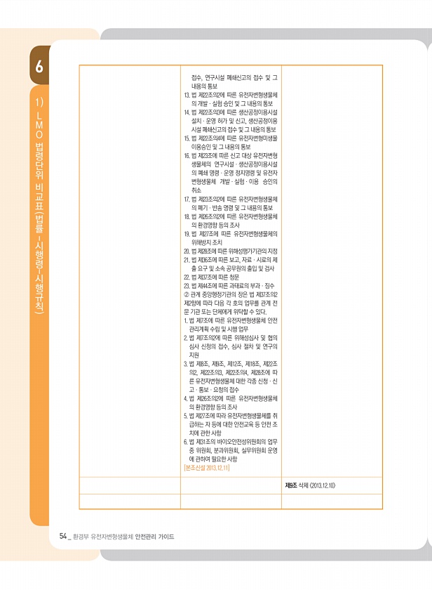 6 54 _ 환경부 유전자변형생물체 안전관리 가이드 1 L M O 법령단위 비교표 법률- 시행령- 시행규칙 접수, 연구시설 폐쇄신고의 접수 및 그 내용의 통보 13. 법 제22조의2에 따른 유전자변형생물체 의 개발ㆍ실험 승인 및 그 내용의 통보 14. 법 제22조의3에 따른 생산공정이용시설 설치ㆍ운영 허가 및 신고, 생산공정이용 시설 폐쇄신고의 접수 및 그 내용의 통보 15. 법 제22조의4에 따른 유전자변형미생물 이용승인 및 그 내용의 통보 16. 법 제23조에 따른 신고 대상 유전자변형 생물체의 연구시설ㆍ생산공정이용시설 의 폐쇄 명령ㆍ운영 정지명령 및 유전자 변형생물체 개발ㆍ실험ㆍ이용 승인의 취소 17. 법 제23조의2에 따른 유전자변형생물체 의 폐기ㆍ반송 명령 및 그 내용의 통보 18. 법 제26조의2...