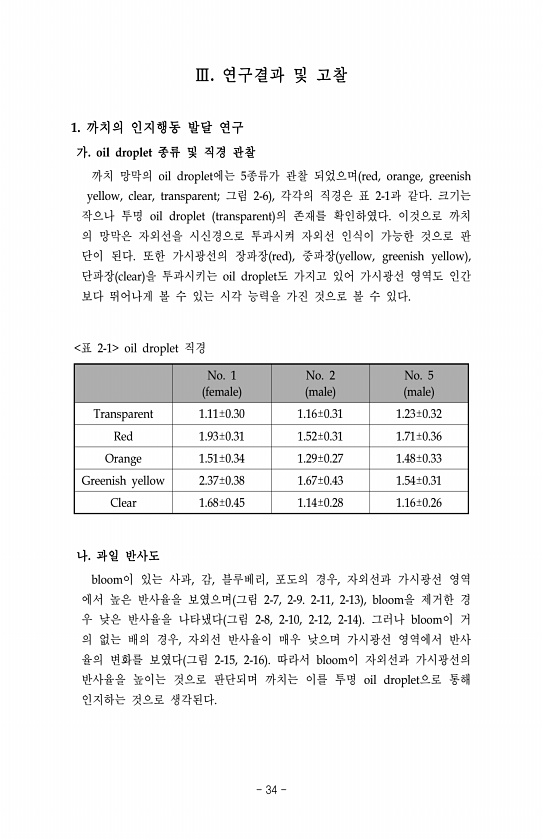 Ⅲ. 연구결과 및 고찰 1. 까치의 인지행동 발달 연구 가. oil droplet 종류 및 직경 관찰 까치 망막의 oil droplet에는 5종류가 관찰 되었으며 red, orange, greenish yellow, clear, transparent; 그림 2-6 , 각각의 직경은 표 2-1과 같다. 크기는 작으나 투명 oil droplet transparent 의 존재를 확인하였다. 이것으로 까치 의 망막은 자외선을 시신경으로 투과시켜 자외선 인식이 가능한 것으로 판 단이 된다. 또한 가시광선의 장파장 red , 중파장 yellow, greenish yellow , 단파장 clear 을 투과시키는 oil droplet도 가지고 있어 가시광선 영역도 인간 보다 뛰어나게 볼 수 있는 시각 능력을 가진 것으로 ...