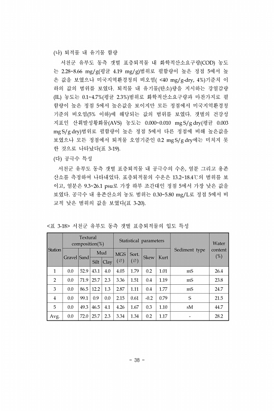 38 나 퇴적물 내 유기물 함량 서천군 유부도 동측 갯벌 표층퇴적물 내 화학적산소요구량 COD 농도 는 2.288.66 mg/g 평균 4.19 mg/g 범위로 펄함량이 높은 정점 5에서 높 은 값을 보였으나 미국지역환경청의 비오염 40 mg/g-dry, 4% 기준치 이 하의 값의 범위를 보였다. 퇴적물 내 유기물 탄소 량을 지시하는 강열감량 IL 농도는 0.14.7% 평균 2.3% 범위로 화학적산소요구량과 마찬가지로 펄 함량이 높은 정점 5에서 높은값을 보이지만 모든 정점에서 미국지역환경청 기준의 비오염 5% 이하 에 해당되는 값의 범위를 보였다. 갯벌의 건강성 지표인 산휘발성황화물 AVS 농도는 0.0000.010 mg S/g dry 평균 0.003 mg S/g dry 범위로 펄함량이 높은 정점 5에서 다...
