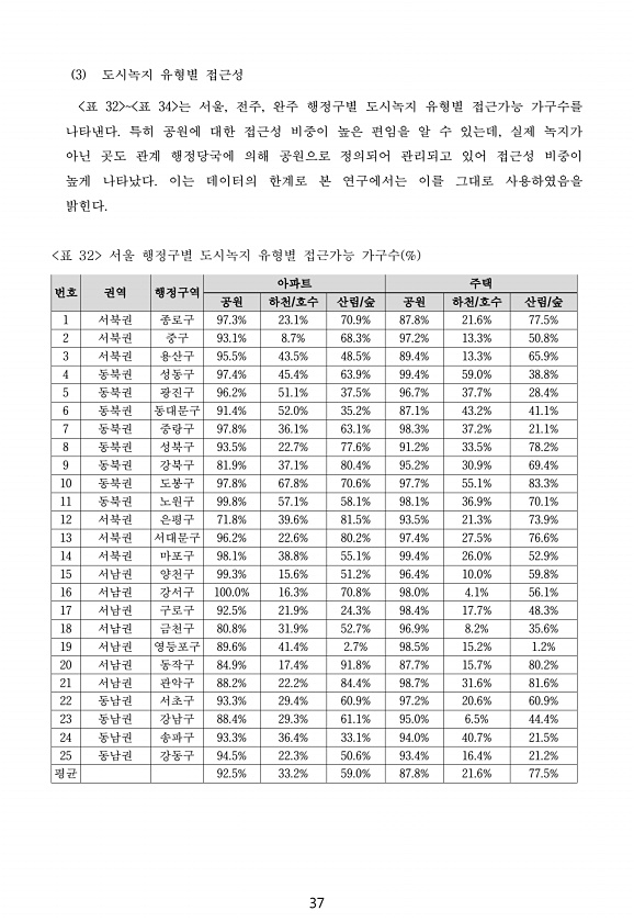 37 3 도시녹지 유형별 접근성 표 32 표 34 는 서울, 전주, 완주 행정구별 도시녹지 유형별 접근가능 가구수를 나타낸다. 특히 공원에 대한 접근성 비중이 높은 편임을 알 수 있는데, 실제 녹지가 아닌 곳도 관계 행정당국에 의해 공원으로 정의되어 관리되고 있어 접근성 비중이 높게 나타났다. 이는 데이터의 한계로 본 연구에서는 이를 그대로 사용하였음을 밝힌다. 표 32 서울 행정구별 도시녹지 유형별 접근가능 가구수 % 번호 권역 행정구역 아파트 주택 공원 하천/호수 산림/숲 공원 하천/호수 산림/숲 1 서북권 종로구 97.3% 23.1% 70.9% 87.8% 21.6% 77.5% 2 서북권 중구 93.1% 8.7% 68.3% 97.2% 13.3% 50.8% 3 서북권 용산구 95.5% 43.5% 48.5%...