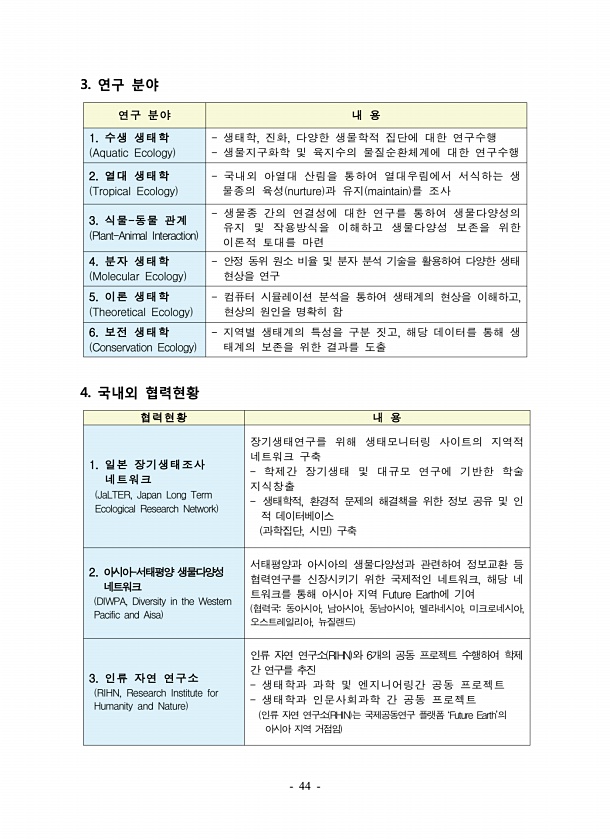 44 3. 연구 분야 연구 분야 내 용 1. 수생 생태학 Aquatic Ecology 생태학, 진화, 다양한 생물학적 집단에 대한 연구수행 생물지구화학 및 육지수의 물질순환체계에 대한 연구수행 2. 열대 생태학 Tropical Ecology 국내외 아열대 산림을 통하여 열대우림에서 서식하는 생 물종의 육성 nurture 과 유지 maintain 를 조사 3. 식물-동물 관계 Plant-Animal Interaction 생물종 간의 연결성에 대한 연구를 통하여 생물다양성의 유지 및 작용방식을 이해하고 생물다양성 보존을 위한 이론적 토대를 마련 4. 분자 생태학 Molecular Ecology 안정 동위 원소 비율 및 분자 분석 기술을 활용하여 다양한 생태 현상을 연구 5. 이론 생태학 Theoretical E...