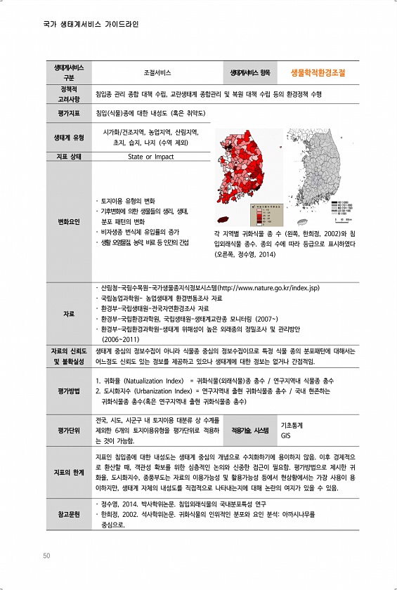 국가 생태계서비스 가이드라인 50 생태계서비스 구분 조절서비스 생태계서비스 항목 생물학적환경조절 정책적 고려사항 침입종 관리 종합 대책 수립, 교란생태계 종합관리 및 복원 대책 수립 등의 환경정책 수행 평가지표 침입 식물 종에 대한 내성도 혹은 취약도 각 지역별 귀화식물 종 수 왼쪽, 한희정, 2002 와 침 입외래식물 종수. 종의 수에 따라 등급으로 표시하였다 오른쪽, 정수영, 2014 생태계 유형 시가화/건조지역, 농업지역, 산림지역, 초지, 습지, 나지 수역 제외 지표 상태 State or Impact 변화요인 · 토지이용 유형의 변화 · 기후변화에 의한 생물들의 생리, 생태, 분포 패턴의 변화 · 비자생종 번식체 유입률의 증가 · 생활 오염물질, 농약, 비료 등 인간의 간섭 자료 · 산림청-국림수목원...