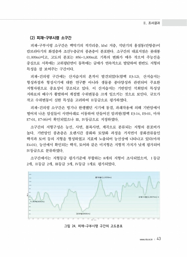 Ⅱ. 조사결과 www.nie.re.kr ? 43 2 피재구부시령 소구간 피재구부시령 소구간은 백악기의 적각리층, kbd 지층, 석탄기의 홍점통 만항층 이 캄브리아기의 화절층과 조선누층군의 풍촌층이 분포한다. 소구간의 대표지점은 푯대봉 1.009m 이고, 고도의 분포는 8561,009m로 기복의 변화가 매우 작으며 주능선을 중심으로 서쪽에는 고위평탄면이 동쪽에는 급애가 연속적으로 발달하여 한반도 지형의 특성을 잘 보여주는 구간이다. 피재건의령 구간에는 산지습지의 흔적이 발견되었다 함백 E3-12 산지습지는 형성과정과 형성시기에 대한 연구뿐 아니라 생물종 종다양성과 관련되어 주요한 지형자원으로 중요성이 강조되고 있다. 이 산지습지는 기반암인 석회암의 특성상 지하로의 배수가 활발하여 계절별 수위변동을 크게 일으키...