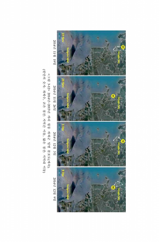 2014년 11월 19일 2014년 11월 26일 2014년 12월 3일 2014년 12월 9일 그림 3-12 2014년2015년 개리 월동 개체군 일별 분포도 계속 원안의 숫자개체수, 굵은 점선지역간 이동, 얇은 점선지역내 이동