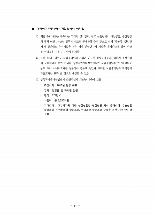 44 n 경제여건으로 인한 기업유치의 어려움 ¡ 최근 우리나라는 계속되는 국내외 경기침체, 전국 산업단지의 과잉공급, 생산공장 의 해외 이전 가속화, 정부의 수도권 규제완화 추진 등으로 인해 ‘장항국가산업단 지’가 원안대로 추진되었을 경우 해당 산업단지에 기업을 유치하는데 있어 상당 한 어려움을 겪을 가능성이 존재함 ¡ 또한, 대안사업으로 국립생태원의 건립과 더불어 장항국가생태산업단지 조성사업 이 포함되었을 뿐만 아니라 장항국가생태산업단지가 국립생태원과 연구개발활동 등에 있어 시너지효과를 창출하는 경우에 원안과 비교한 국립생태원의 지역경제 파급효과는 보다 클 것으로 예상할 수 있음 ¡ 장항국가생태산업단지 조성사업의 개요는 다음과 같음 ▷ 조성시기 2018년 완공 목표 ▷ 입지 장항읍 및 마서면 일원 ▷ 면적...