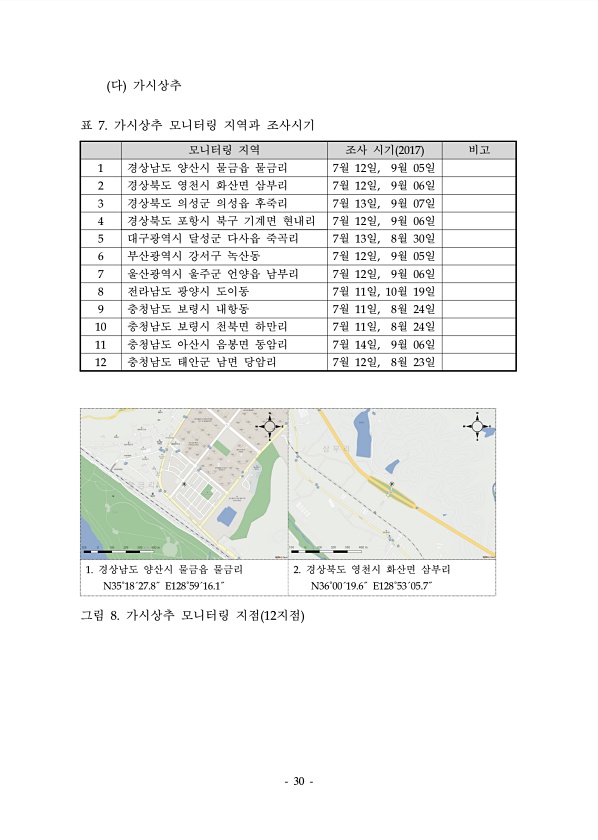 30 다 가시상추 모니터링 지역 조사 시기 2017 비고 1 경상남도 양산시 물금읍 물금리 7월 12일, 9월 05일 2 경상북도 영천시 화산면 삼부리 7월 12일, 9월 06일 3 경상북도 의성군 의성읍 후죽리 7월 13일, 9월 07일 4 경상북도 포항시 북구 기계면 현내리 7월 12일, 9월 06일 5 대구광역시 달성군 다사읍 죽곡리 7월 13일, 8월 30일 6 부산광역시 강서구 녹산동 7월 12일, 9월 05일 7 울산광역시 울주군 언양읍 남부리 7월 12일, 9월 06일 8 전라남도 광양시 도이동 7월 11일, 10월 19일 9 충청남도 보령시 내항동 7월 11일, 8월 24일 10 충청남도 보령시 천북면 하만리 7월 11일, 8월 24일 11 충청남도 아산시 음봉면 동암리 7월 14일, 9월 0...