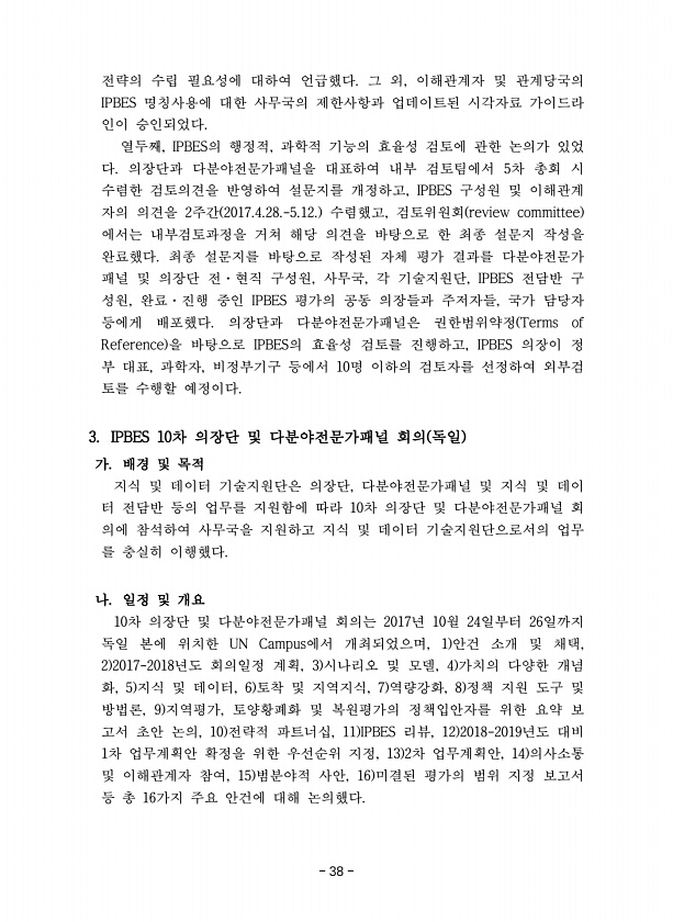 38 전략의 수립 필요성에 대하여 언급했다. 그 외, 이해관계자 및 관계당국의 IPBES 명칭사용에 대한 사무국의 제한사항과 업데이트된 시각자료 가이드라 인이 승인되었다. 열두째, IPBES의 행정적, 과학적 기능의 효율성 검토에 관한 논의가 있었 다. 의장단과 다분야전문가패널을 대표하여 내부 검토팀에서 5차 총회 시 수렴한 검토의견을 반영하여 설문지를 개정하고, IPBES 구성원 및 이해관계 자의 의견을 2주간 2017.4.28.-5.12. 수렴했고, 검토위원회 review committee 에서는 내부검토과정을 거쳐 해당 의견을 바탕으로 한 최종 설문지 작성을 완료했다. 최종 설문지를 바탕으로 작성된 자체 평가 결과를 다분야전문가 패널 및 의장단 전·현직 구성원, 사무국, 각 기술지원단, IPBES 전담...