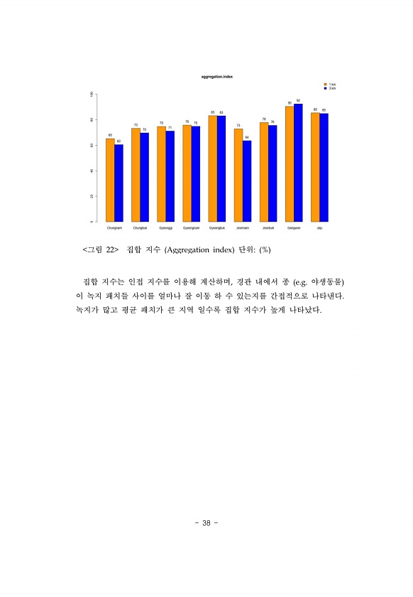 38 그림 22 집합 지수 Aggregation index 단위% 집합 지수는 인접 지수를 이용해 계산하며, 경관 내에서 종 e.g. 야생동물 이 녹지 패치들 사이를 얼마나 잘 이동 하 수 있는지를 간접적으로 나타낸다. 녹지가 많고 평균 패치가 큰 지역 일수록 집합 지수가 높게나타났다.