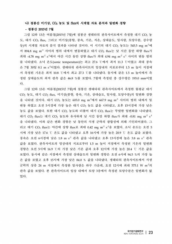 나 점봉산 미기상, CO2 농도 및 flux의 시계열 자료 분석과 일변화 경향 점봉산 년 월 그림 와 은 여름철 년 월 에 점봉산 생태타워 관측사이트에서 측정한 대기 농 도 대기 그리고 미기상 풍향 풍속 기온 지온 상대습도 일사량 토양수분 강수량 등 의 시계열 자료의 분석 결과를 나타낸 것이다 이 시기의 대기 농도는 에 서 사이의 범위 내에서 변동하였고 대기 는 낮 시간 동안 하향 가 최대 에서 야간 시간 동안 상향 가 최대 사이의 변동 범위 를 나타냈다 소닉 온도 는 최고 에서 최저 이였고 최대 풍속 은 월 일 이였다 생태타워 관측사이트의 임상내의 지표로부터 높이 지점에 서 측정된 기온은 최저 에서 최고 를 나타냈다 동시에 같은 높이에서 측 정된 상대습도의 최저 관측 값은 를 보였다 월에 측정된 총 강수량...