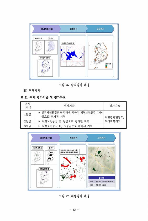 42 그림 26. 습지평가 과정 4 지형평가 지형 평가 평가기준 평가자료 1등급 ? 전국자연환경조사 결과에 의하여 지형보전등급 Ⅰ등 급으로 평가된 지역 지형경관현황도, 2등급 ? 지형보전등급 Ⅱ 등급으로 평가된 지역 토지피복지도 3등급 ? 지형보전등급 Ⅲ, Ⅳ등급으로 평가된 지역 표 21. 지형 평가기준 및 평가자료 그림 27. 지형평가과정