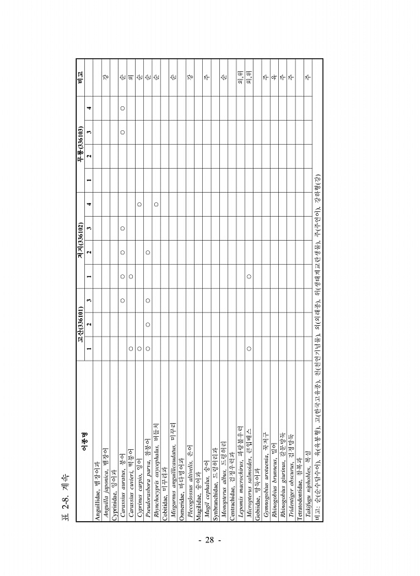 어종명 고산 336101 저지 336102 무릉 336103 비고 1 2 3 1 2 3 4 1 2 3 4 Anguillidae, 뱀장어과 Anguilla japonica, 뱀장어 강 Cyprinidae, 잉어과 Carassius auratus, 붕어 ○ ○ ○ ○ ○ ○ 순 Carassius cuvieri, 떡붕어 ○ ○ 외 Cyprinus carpio, 잉어 ○ ○ 순 Pseudorasbora parva, 참붕어 ○ ○ ○ ○ 순 Rhynchocypris oxycephalus, 버들치 ○ 순 Cobitidae, 미꾸리과 Misgurnus anguillicaudatus, 미꾸리 순 Osmeridae, 바다빙어과 Plecoglossus altivelis, 은어 강 Mugilidae, 숭어과 Mugil ceph...