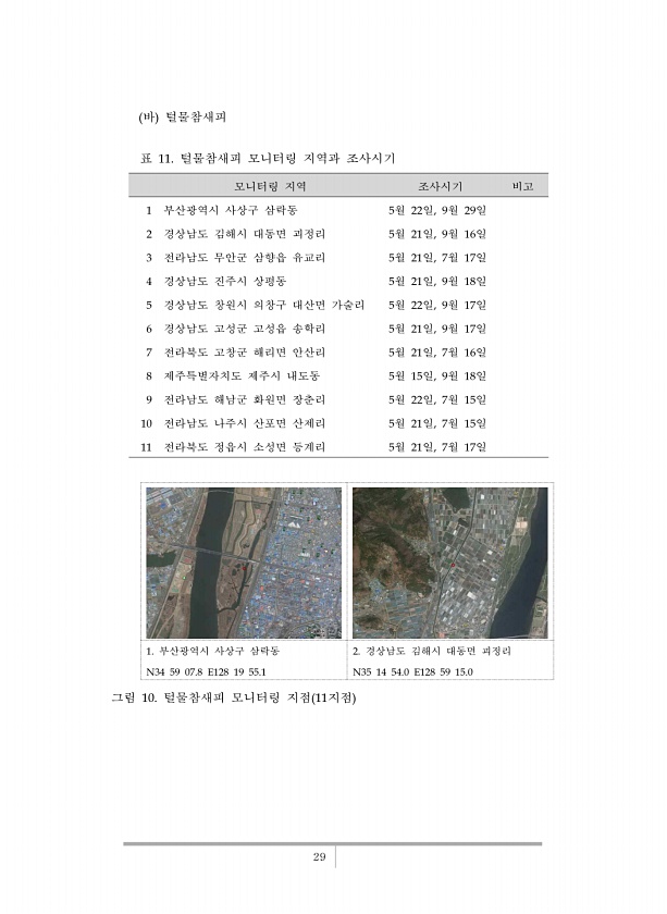 29 모니터링 지역 조사시기 비고 1 부산광역시 사상구 삼락동 5월 22일, 9월 29일 2 경상남도 김해시 대동면 괴정리 5월 21일, 9월 16일 3 전라남도 무안군 삼향읍 유교리 5월 21일, 7월 17일 4 경상남도 진주시 상평동 5월 21일, 9월 18일 5 경상남도 창원시 의창구 대산면 가술리 5월 22일, 9월 17일 6 경상남도 고성군 고성읍 송학리 5월 21일, 9월 17일 7 전라북도 고창군 해리면 안산리 5월 21일, 7월 16일 8 제주특별자치도 제주시 내도동 5월 15일, 9월 18일 9 전라남도 해남군 화원면 장춘리 5월 22일, 7월 15일 10 전라남도 나주시 산포면 산제리 5월 21일, 7월 15일 11 전라북도 정읍시 소성면 등계리 5월 21일, 7월 17일 바 털물참새피 표...