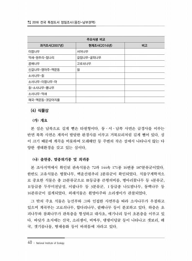 2016 전국 특정도서 정밀조사 옹진-남부권역 40 ? National Institute of Ecology 주요식생 비교 과거조사 2007년 현재조사 2016년 비고 이팝나무 서어나무 억새-원추리-참나리 갈참나무-굴피나무 콩배나무 고로쇠나무 신갈나무-명아주-맥문동 칡 소사나무-칡 소사나무-이팝나무-마 칡-소사나무-뽕나무 소사나무-억새 해국-맥문동-갯강아지풀 4 식물상 가 개요 본 섬은 남북으로 길게 뻗은 타원형이다. 동·서·남쪽 사면은 급경사를 이루는 반면 북쪽 사면은 계곡이 발달한 완경사를 이루고 거북꼬리처럼 길게 뻘어 있다. 섬 이 크기 때문에 계곡을 비롯하여 모래해안 등 주변의 작은 섬에서 나타나지 않는 다 양한 생태환경을 갖고 있는 섬이다. 나 출현종, 멸종위기종 및 희귀종 본 조사지역에서 확인된 ...