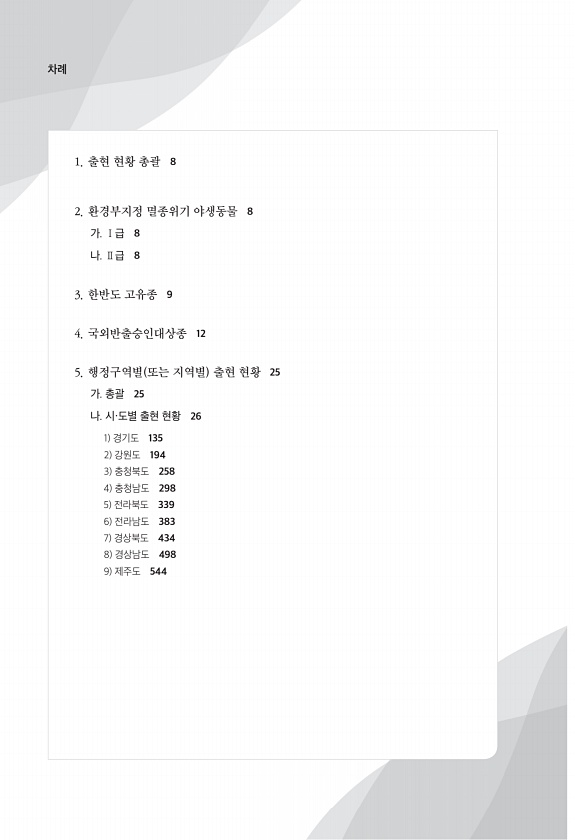 차례 1. 출현 현황 총괄 8 2. 환경부지정 멸종위기 야생동물 8 가. Ⅰ급 8 나. Ⅱ급 8 3. 한반도 고유종 9 4. 국외반출승인대상종 12 5. 행정구역별 또는 지역별 출현 현황 25 가. 총괄 25 나. 시·도별 출현 현황 26 1 경기도 135 2 강원도 194 3 충청북도 258 4 충청남도 298 5 전라북도 339 6 전라남도 383 7 경상북도 434 8 경상남도 498 9 제주도544