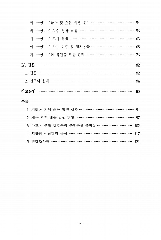 마 구상나무군락 및 숲틈 식생 분석 바 구상나무 치수 정착 특성 사 구상나무 고사 특성 아 구상나무 가해 곤충 및 절지동물 자 구상나무의 복원을 위한 준비 결론 결론 연구의 한계 참고문헌 부록 지리산 지역 태풍 발생 현황 제주 지역 태풍 발생 현황 아고산 분포 침엽수림 분광특성 측정값 토양의 이화학적 특성 현장조사표 iv