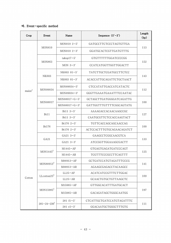 43 바. Event-specific method Crop Event Name Sequence 5’-3’ Length bp maize1 MON810 MON810 2-5GATGCCTTCTCCCTAGTGTTGA 113 MON810 2-3GGATGCACTCGTTGATGTTTG MON863 tahsp17-5GTGTTTTTTGGATCCCCGG 152 MON 3-3CCATCATGGTTGGTTGGACTT NK603 NK603 01-5TATCTTGCTCGATGCCTTCTCC 143 NK603 01-3ACACCATTGCAGATTCTGCTAACT MON89034 MON89034-5CTCCATATTGACCATCATACTC 112 MON89034-3GGGTTGAAATGAAATTTCCAATAC MON88017 MON88017-G-...