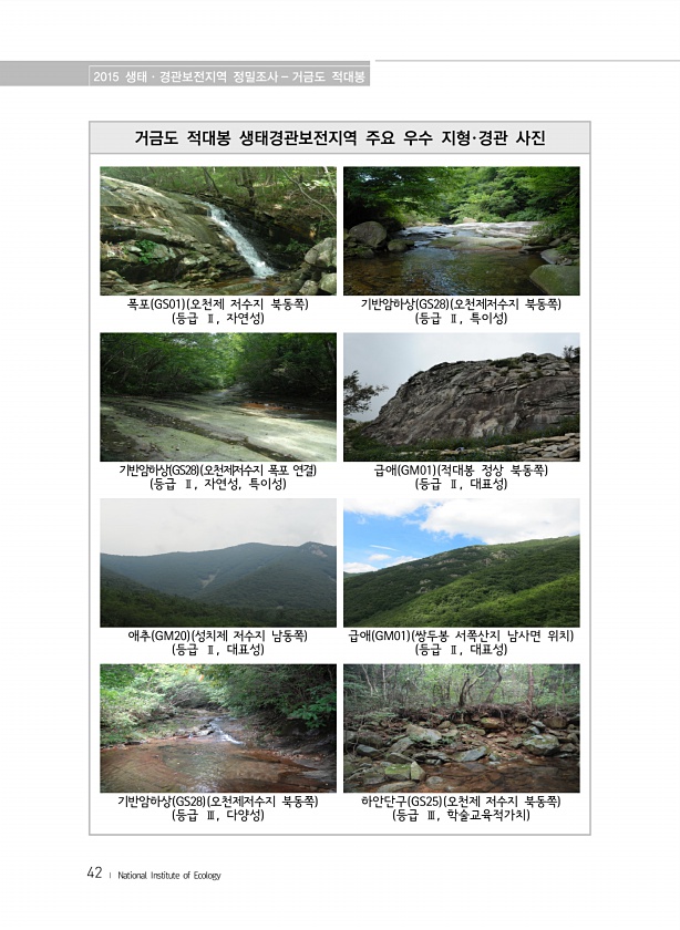 2015 생태·경관보전지역 정밀조사 거금도 적대봉 42 ? National Institute of Ecology 거금도 적대봉 생태경관보전지역 주요 우수 지형·경관 사진 폭포 GS01 오천제 저수지 북동쪽 등급 Ⅱ, 자연성 기반암하상 GS28 오천제저수지 북동쪽 등급 Ⅱ, 특이성 기반암하상 GS28 오천제저수지 폭포 연결 등급 Ⅱ, 자연성, 특이성 급애 GM01 적대봉 정상 북동쪽 등급 Ⅱ, 대표성 애추 GM20 성치제 저수지 남동쪽 등급 Ⅱ, 대표성 급애 GM01 쌍두봉 서쪽산지 남사면 위치 등급 Ⅱ, 대표성 기반암하상 GS28 오천제저수지 북동쪽 등급 Ⅲ, 다양성 하안단구 GS25 오천제 저수지 북동쪽 등급 Ⅲ, 학술교육적가치
