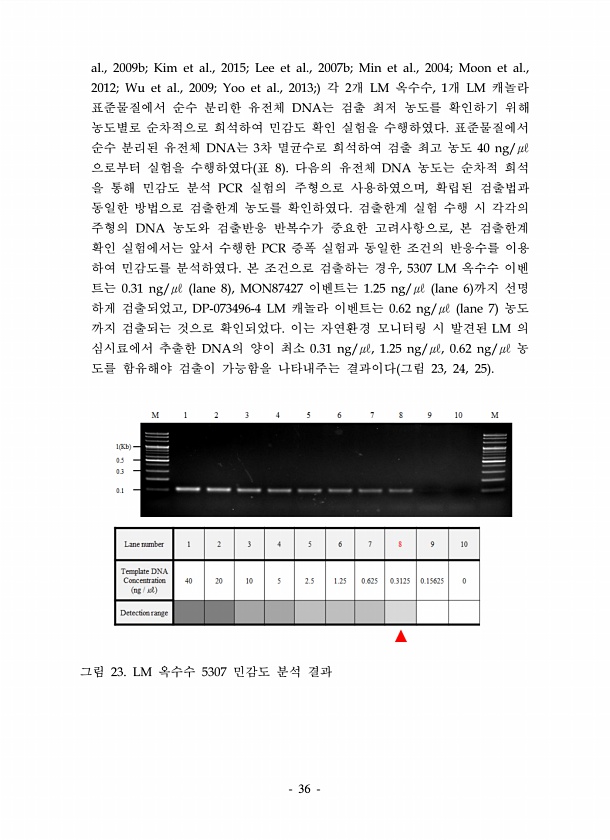 36 al., 2009b; Kim et al., 2015; Lee et al., 2007b; Min et al., 2004; Moon et al., 2012; Wu et al., 2009; Yoo et al., 2013; 각 2개 LM 옥수수, 1개 LM 캐놀라 표준물질에서 순수 분리한 유전체 DNA는 검출 최저 농도를 확인하기 위해 농도별로 순차적으로 희석하여 민감도 확인 실험을 수행하였다. 표준물질에서 순수 분리된 유전체 DNA는 3차 멸균수로 희석하여 검출 최고 농도 40 ng/㎕ 으로부터 실험을 수행하였다 표 8 다음의 유전체 DNA 농도는 순차적 희석 을 통해 민감도 분석 PCR 실험의 주형으로 사용하였으며, 확립된 검출법과 동일한 방법으로 검출한계 농도를 확인하였다. 검출한계 실험 수행 시 각각의...