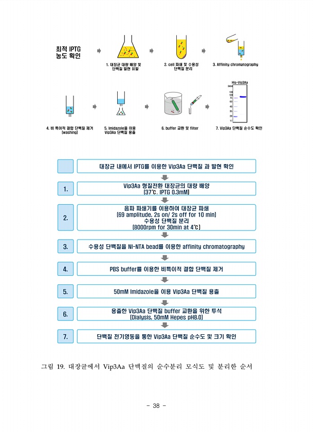 그림 19. 대장균에서 Vip3Aa 단백질의 순수분리 모식도 및 분리한순서