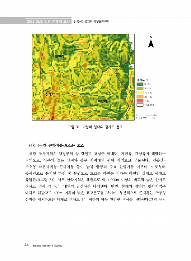 2015 DMZ 일원 생태계 조사 민통선이북지역 동부해안권역 44 ? National Institute of Ecology 그림 31. 마달리 일대의 경사도 분포 라 4구간 큰까치봉/오소동 코스 해당 조사지역은 행정구역 상 강원도 고성군 현내면, 거진읍, 간성읍에 해당하는 지역으로, 서부의 높은 산지와 동부 저지대의 평야 지역으로 구분된다. 건봉산조소봉작은까치봉큰까치봉 등이 남북 방향의 주요 산줄기를 이루며, 이로부터 동서편으로 분기된 하천 중 동편으로 흐르는 하천은 저차수 하천인 상태로 동해로 유입된다 그림 32 서부 산악지역은 해발고도 약 1,000m 이상의 비교적 높은 산지로 경사도 역시 약 30° 내외의 급경사를 나타낸다. 반면, 동해와 접하는 평야지역은 대체로 해발고도 400m 이하의 낮은 표고분포...