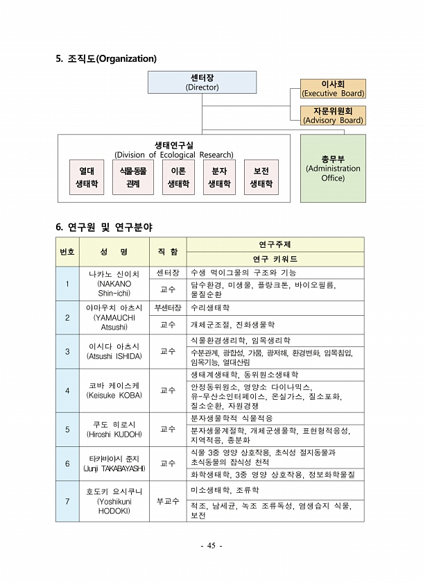 45 번호 성 명 직 함 연구주제 연구 키워드 1 나카노 신이치 NAKANO Shin-ichi 센터장 수생 먹이그물의 구조와 기능 교수 담수환경, 미생물, 플랑크톤, 바이오필름, 물질순환 2 야마우치 아츠시 YAMAUCHI Atsushi 부센터장 수리생태학 교수 개체군조절, 진화생물학 3 이시다 아츠시 Atsushi ISHIDA 교수 식물환경생리학, 임목생리학 수분관계, 광합성, 가뭄, 광저해, 환경변화, 임목침입, 임목기능, 열대산림 4 코바 케이스케 Keisuke KOBA 교수 생태계생태학, 동위원소생태학 안정동위원소, 영양소 다이나믹스, 유-무산소인터페이스, 온실가스, 질소포화, 질소순환, 자원경쟁 5 쿠도 히로시 Hiroshi KUDOH 교수 분자생물학적 식물적응 분자생물계절학, 개체군생물학, 표현형...