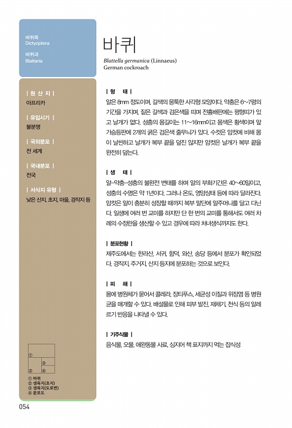 054 ① ② ③ ④ ① 바퀴 ② 생육지 초지 ③ 생육지 도로변 ④ 분포도 | 형 태 | 알은 8mm 정도이며, 갈색의 뭉툭한 사각형 모양이다. 약충은 67령의 기간을 가지며, 짙은 갈색과 검은색을 띠며 전흉배판에는 평형띠가 있 고 날개가 없다. 성충의 몸길이는 1116mm이고 몸색은 황색이며 앞 가슴등판에 2개의 굵은 검은색 줄무늬가 있다. 수컷은 암컷에 비해 몸 이 날씬하고 날개가 복부 끝을 덮진 않지만 암컷은 날개가 복부 끝을 완전히 덮는다. | 생 태 | 알-약충-성충의 불완전 변태를 하며 알의 부화기간은 4060일이고, 성충의 수명은 약 1년이다. 그러나 온도, 영양상태 등에 따라 달라진다. 암컷은 알이 충분히 성장할 때까지 복부 말단에 알주머니를 달고 다닌 다. 일생에 여러 번 교미를 하지만 단 ...