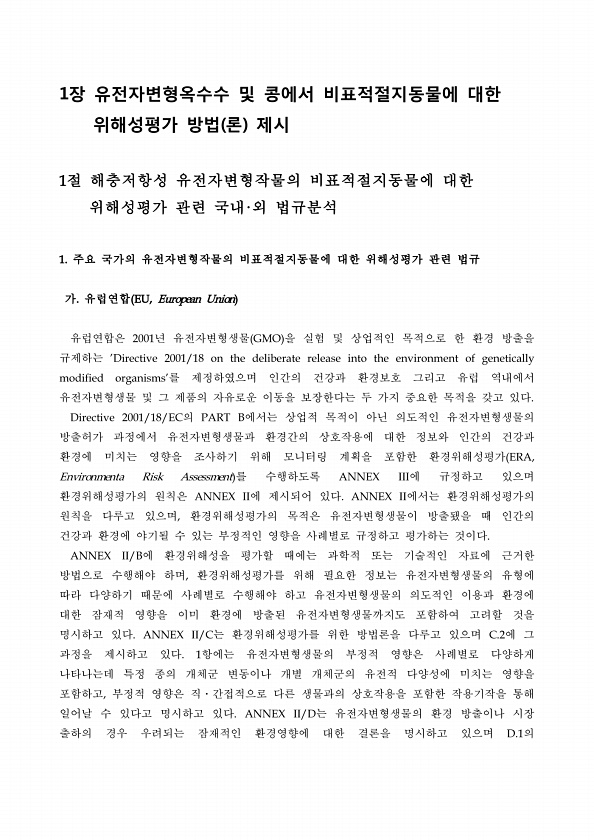 1장 유전자변형옥수수 및 콩에서 비표적절지동물에 대한 위해성평가 방법 론 제시 1절 해충저항성 유전자변형작물의 비표적절지동물에 대한 위해성평가 관련 국내·외 법규분석 1. 주요 국가의 유전자변형작물의 비표적절지동물에 대한 위해성평가 관련 법규 가. 유럽연합 EU, European Union 유럽연합은 2001년 유전자변형생물 GMO 을 실험 및 상업적인 목적으로 한 환경 방출을 규제하는 Directive 2001/18 on the deliberate release into the environment of genetically modified organisms를 제정하였으며 인간의 건강과 환경보호 그리고 유럽 역내에서 유전자변형생물 및 그 제품의 자유로운 이동을 보장한다는 두 가지 중요한 목적을 갖고 있다....