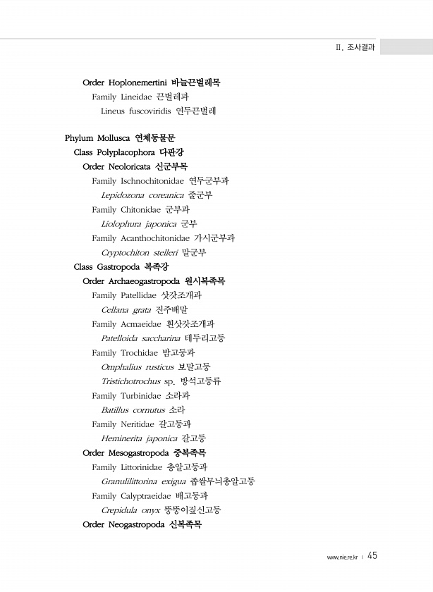 Ⅱ. 조사결과 www.nie.re.kr ? 45 Order Hoplonemertini 바늘끈벌레목 Family Lineidae 끈벌레과 Lineus fuscoviridis 연두끈벌레 Phylum Mollusca 연체동물문 Class Polyplacophora 다판강 Order Neoloricata 신군부목 Family Ischnochitonidae 연두군부과 Lepidozona coreanica 줄군부 Family Chitonidae 군부과 Liolophura japonica 군부 Family Acanthochitonidae 가시군부과 Cryptochiton stelleri 말군부 Class Gastropoda 복족강 Order Archaeogastropoda 원시복족목 Family Patellidae 삿갓...