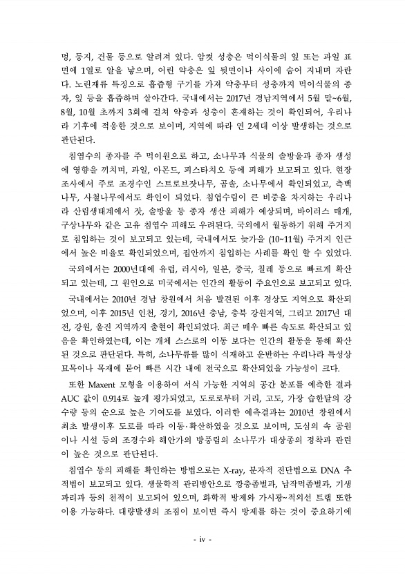 iv 멍, 둥지, 건물 등으로 알려져 있다. 암컷 성충은 먹이식물의 잎 또는 과일 표 면에 1열로 알을 낳으며, 어린 약충은 잎 뒷면이나 사이에 숨어 지내며 자란 다. 노린재류 특징으로 흡즙형 구기를 가져 약충부터 성충까지 먹이식물의 종 자, 잎 등을 흡즙하며 살아간다. 국내에서는 2017년 경남지역에서 5월 말6월, 8월, 10월 초까지 3회에 걸쳐 약충과 성충이 혼재하는 것이 확인되어, 우리나 라 기후에 적응한 것으로 보이며, 지역에 따라 연 2세대 이상 발생하는 것으로 판단된다. 침염수의 종자를 주 먹이원으로 하고, 소나무과 식물의 솔방울과 종자 생성 에 영향을 끼치며, 과일, 아몬드, 피스타치오 등에 피해가 보고되고 있다. 현장 조사에서 주로 조경수인 스트로브잣나무, 곰솔, 소나무에서 확인되었고, 측...