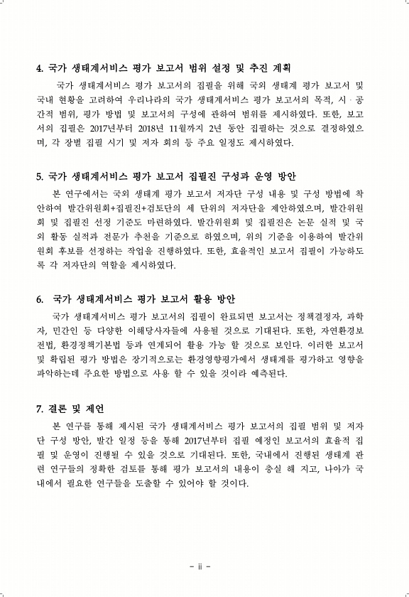 ii 4. 국가 생태계서비스 평가 보고서 범위 설정 및 추진 계획 국가 생태계서비스 평가 보고서의 집필을 위해 국외 생태계 평가 보고서 및 국내 현황을 고려하여 우리나라의 국가 생태계서비스 평가 보고서의 목적, 시?공 간적 범위, 평가 방법 및 보고서의 구성에 관하여 범위를 제시하였다. 또한, 보고 서의 집필은 2017년부터 2018년 11월까지 2년 동안 집필하는 것으로 결정하였으 며, 각 장별 집필 시기 및 저자 회의 등 주요 일정도 제시하였다. 5. 국가 생태계서비스 평가 보고서 집필진 구성과 운영 방안 본 연구에서는 국외 생태계 평가 보고서 저자단 구성 내용 및 구성 방법에 착 안하여 발간위원회+집필진+검토단의 세 단위의 저자단을 제안하였으며, 발간위원 회 및 집필진 선정 기준도 마련하였다. 발간위원...
