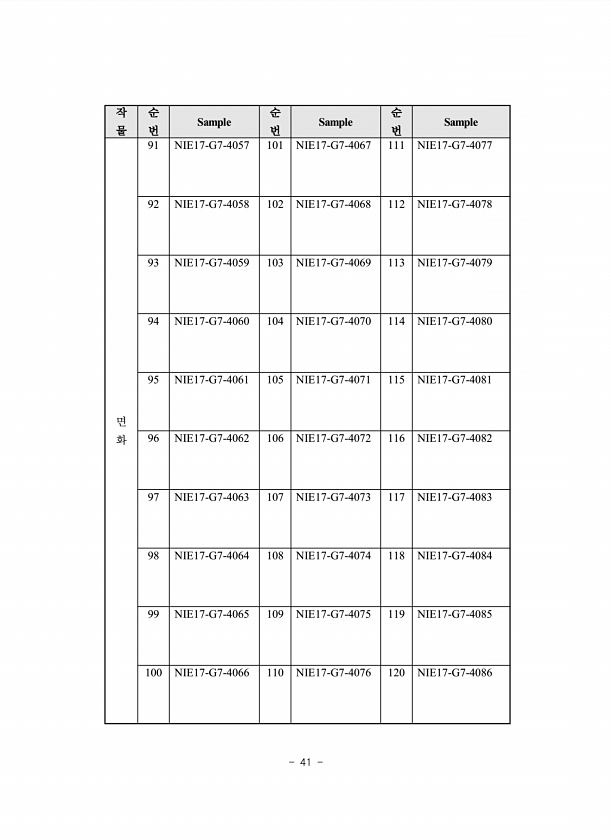 41 작 물 순 번 Sample 순 번 Sample 순 번 Sample 면 화 91 NIE17-G7-4057 101 NIE17-G7-4067 111 NIE17-G7-4077 92 NIE17-G7-4058 102 NIE17-G7-4068 112 NIE17-G7-4078 93 NIE17-G7-4059 103 NIE17-G7-4069 113 NIE17-G7-4079 94 NIE17-G7-4060 104 NIE17-G7-4070 114 NIE17-G7-4080 95 NIE17-G7-4061 105 NIE17-G7-4071 115 NIE17-G7-4081 96 NIE17-G7-4062 106 NIE17-G7-4072 116 NIE17-G7-4082 97 NIE17-G7-4063 107 NIE17-G7-4073 117...