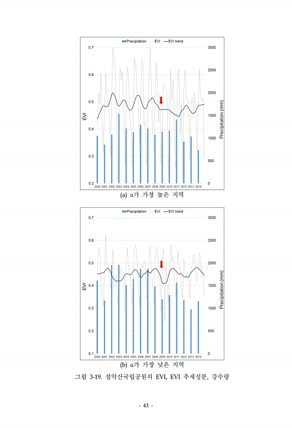 43 a α가 가장 높은 지역 b α가 가장 낮은 지역 그림 3-19. 설악산국립공원의 EVI, EVI 추세성분,강수량