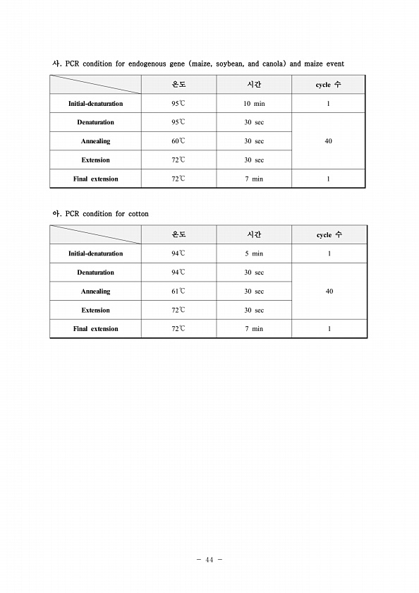 44 사. PCR condition for endogenous gene maize, soybean, and canola and maize event 온도 시간 cycle 수 Initial-denaturation 95℃ 10 min 1 Denaturation 95℃ 30 sec Annealing 60℃ 30 sec 40 Extension 72℃ 30 sec Final extension 72℃ 7 min 1 아. PCR condition for cotton 온도 시간 cycle 수 Initial-denaturation 94℃ 5 min 1 Denaturation 94℃ 30 sec Annealing 61℃ 30 sec 40 Extension 72℃ 30 sec Final extension 72℃ 7 min1
