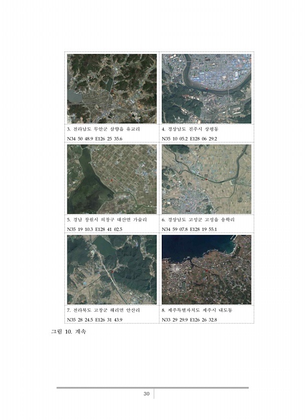 30 3. 전라남도 무안군 삼향읍 유교리 N34 50 48.9 E126 25 35.6 4. 경상남도 진주시 상평동 N35 10 05.2 E128 06 29.2 5. 경남 창원시 의창구 대산면 가술리 N35 19 10.3 E128 41 02.5 6. 경상남도 고성군 고성읍 송학리 N34 59 07.8 E128 19 55.1 7. 전라북도 고창군 해리면 안산리 N35 28 24.5 E126 31 43.9 8. 제주특별자치도 제주시 내도동 N33 29 29.9 E126 26 32.8 그림 10.계속