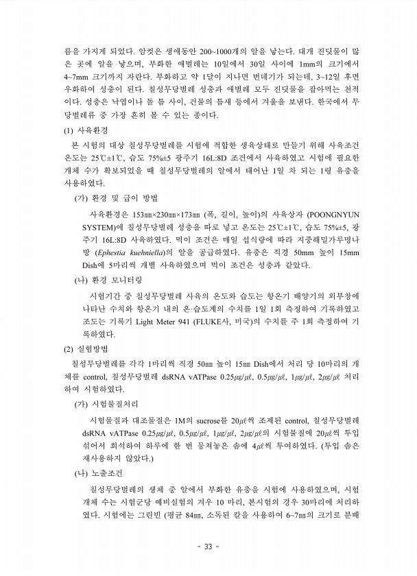 33 2001000 , 10 30 1mm 47mm 1 , 312 , 1 25℃±1℃, 75%±5 16L8D 1 1 153㎜×230㎜×173㎜ , , POONGNYUN SYSTEM 25℃±1℃, 75%±5, 16L8D Ephestia kuehniella 50mm 15mm Dish 5 · 1 1 Light Meter 941 FLUKE , 1 2 1 50㎜ 15㎜ Dish 10 control, dsRNA vATPase 0.25㎍/㎕, 0.5㎍/㎕, 1㎍/㎕, 2㎍/㎕ 1M sucrose 20㎕ control, dsRNA vATPase 0.25㎍/㎕, 0.5㎍/㎕, 1㎍/㎕, 2㎍/㎕ 20㎕ 4㎕ , 10 , 30 84㎜, 67㎜