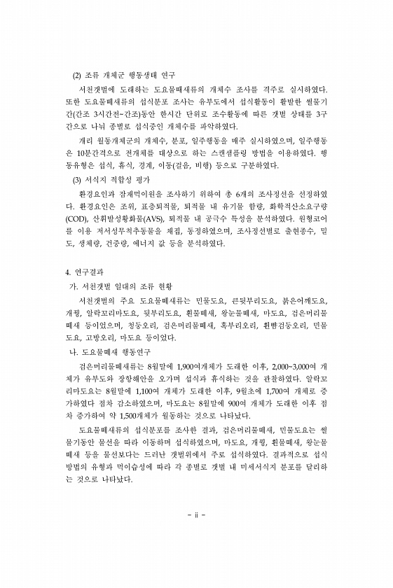 ii 2 조류 개체군 행동생태 연구 서천갯벌에 도래하는 도요물때새류의 개체수 조사를 격주로 실시하였다. 또한 도요물떼새류의 섭식분포 조사는 유부도에서 섭식활동이 활발한 썰물기 간 간조 3시간전간조 동안 한시간 단위로 조수활동에 따른 갯벌 상태를 3구 간으로 나눠 종별로 섭식중인 개체수를 파악하였다. 개리 월동개체군의 개체수, 분포, 일주행동을 매주 실시하였으며, 일주행동 은 10분간격으로 전개체를 대상으로 하는 스캔샘플링 방법을 이용하였다. 행 동유형은 섭식, 휴식, 경계, 이동 걸음, 비행 등으로 구분하였다. 3 서식지 적합성 평가 환경요인과 잠재먹이원을 조사하기 위하여 총 6개의 조사정선을 선정하였 다. 환경요인은 조위, 표층퇴적물, 퇴적물 내 유기물 함량, 화학적산소요구량 COD , 산휘발성황화물 AV...