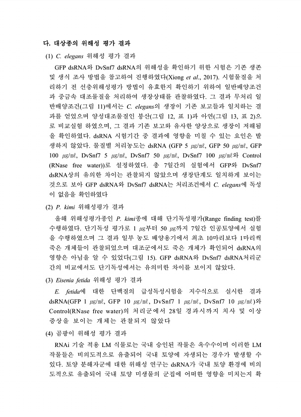다. 대상종의 위해성 평가 결과 1 C. elegans 위해성 평가 결과 GFP dsRNA와 DvSnf7 dsRNA의 위해성을 확인하기 위한 시험은 기존 생존 및 생식 조사 방법을 참고하여 진행하였다 Xiong et al., 2017 시험물질을 처 리하기 전 선충위해성평가 방법이 유효한지 확인하기 위하여 일반배양조건 과 중금속 대조물질을 처리하여 생장상태를 관찰하였다. 그 결과 무처리 일 반배양조건 그림 11 에서는 C. elegans의 생장이 기존 보고들과 일치하는 결 과를 얻었으며 양성대조물질인 붕산 그림 12, 표 1 과 아연 그림 13, 표 2 으 로 비교실험 하였으며, 그 결과 기존 보고와 유사한 양상으로 생장이 저해됨 을 확인하였다. dsRNA 시험기간 중 결과에 영향을 미칠 수 있는 요인은 발 ...