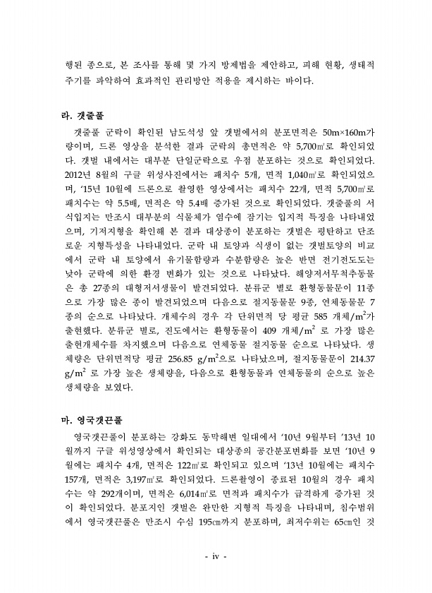 iv 행된 종으로, 본 조사를 통해 몇 가지 방제법을 제안하고, 피해 현황, 생태적 주기를 파악하여 효과적인 관리방안 적용을 제시하는 바이다. 라. 갯줄풀 갯줄풀 군락이 확인된 남도석성 앞 갯벌에서의 분포면적은 50m×160m가 량이며, 드론 영상을 분석한 결과 군락의 총면적은 약 5,700㎡로 확인되었 다. 갯벌 내에서는 대부분 단일군락으로 우점 분포하는 것으로 확인되었다. 2012년 8월의 구글 위성사진에서는 패치수 5개, 면적 1,040㎡로 확인되었으 며, ‘15년 10월에 드론으로 촬영한 영상에서는 패치수 22개, 면적 5,700㎡로 패치수는 약 5.5배, 면적은 약 5.4배 증가된 것으로 확인되었다. 갯줄풀의 서 식입지는 만조시 대부분의 식물체가 염수에 잠기는 입지적 특징을 나타내었 으며, 기저지형...