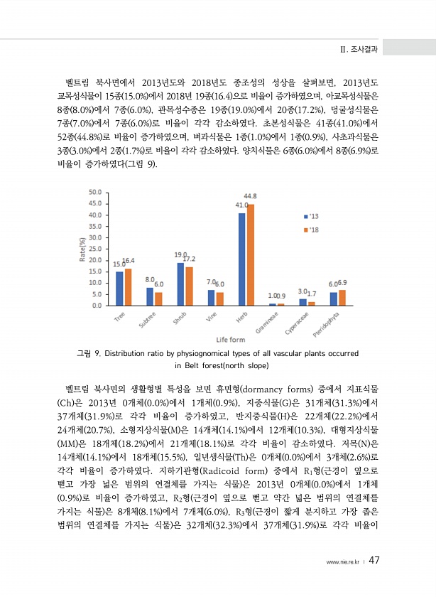Ⅱ. 조사결과 www.nie.re.kr ? 47 벨트림 북사면에서 2013년도와 2018년도 종조성의 성상을 살펴보면, 2013년도 교목성식물이 15종 15.0% 에서 2018년 19종 16.4 으로 비율이 증가하였으며, 아교목성식물은 8종 8.0% 에서 7종 6.0% , 관목성수종은 19종 19.0% 에서 20종 17.2% , 덩굴성식물은 7종 7.0% 에서 7종 6.0% 로 비율이 각각 감소하였다. 초본성식물은 41종 41.0% 에서 52종 44.8% 로 비율이 증가하였으며, 벼과식물은 1종 1.0% 에서 1종 0.9% , 사초과식물은 3종 3.0% 에서 2종 1.7% 로 비율이 각각 감소하였다. 양치식물은 6종 6.0% 에서 8종 6.9% 로 비율이 증가하였다 그림 9 그림 9. Distribution...