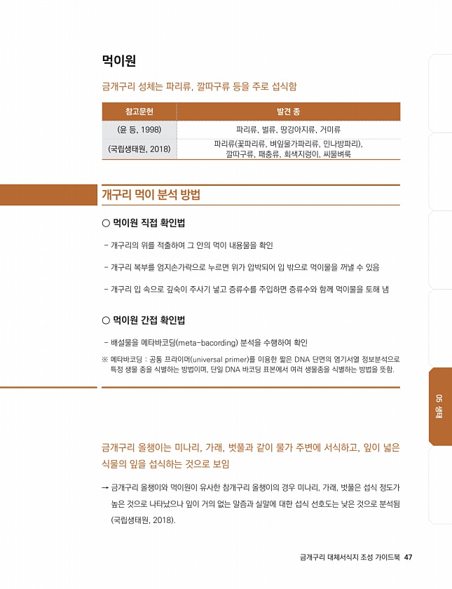 05. 금개구리의 생태 05 생태 참고문헌 발견 종 윤 등, 1998 파리류, 벌류, 땅강아지류, 거미류 국립생태원, 2018 파리류 꽃파리류, 벼잎물가파리류, 민나방파리 , 깔따구류, 패충류, 회색지렁이, 씨물벼룩 먹이원 금개구리 성체는 파리류, 깔따구류 등을 주로 섭식함 금개구리 올챙이는 미나리, 가래, 벗풀과 같이 물가 주변에 서식하고, 잎이 넓은 식물의 잎을 섭식하는 것으로 보임 → 금개구리 올챙이와 먹이원이 유사한 참개구리 올챙이의 경우 미나리, 가래, 벗풀은 섭식 정도가 높은 것으로 나타났으나 잎이 거의 없는 말즘과 실말에 대한 섭식 선호도는 낮은 것으로 분석됨 국립생태원, 2018 개구리 먹이 분석 방법 ○ 먹이원 직접 확인법 개구리의 위를 적출하여 그 안의 먹이 내용물을 확인 개구리 복부를 엄...