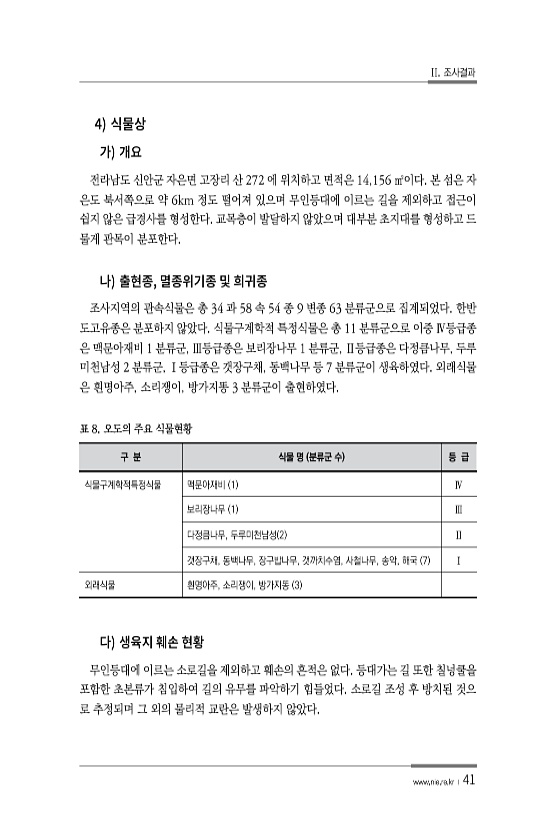 II. 조사결과 www.nie.re.kr ? 41 4 전라남도 신안군 자은면 고장리 산 272 에 위치하고 면적은 14,156 ㎡이다. 본 섬은 자 은도 북서쪽으로 약 6km 정도 떨어져 있으며 무인등대에 이르는 길을 제외하고 접근이 쉽지 않은 급경사를 형성한다. 교목층이 발달하지 않았으며 대부분 초지대를 형성하고 드 물게 관목이 분포한다. , 조사지역의 관속식물은 총 34 과 58 속 54 종 9 변종 63 분류군으로 집계되었다. 한반 도고유종은 분포하지 않았다. 식물구계학적 특정식물은 총 11 분류군으로 이중 Ⅳ등급종 은 맥문아재비 1 분류군, Ⅲ등급종은 보리장나무 1 분류군, Ⅱ등급종은 다정큼나무, 두루 미천남성 2 분류군, Ⅰ등급종은 갯장구채, 동백나무 등 7 분류군이 생육하였다. 외래식물 은 흰명아...