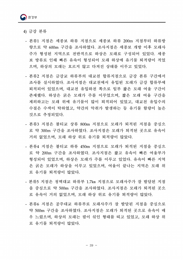 39 4 금강 본류 본류1 지점은 세종보 하류 지점으로 세종보 하류 200m 지점부터 하류방 향으로 약 600m 구간을 조사하였다. 조사지점은 세종보 개방 이후 모래사 주가 형성된 지역으로 전반적으로 하상은 모래로 구성되어 있었다. 세종 보 방류로 인해 빠른 유속이 형성되어 모래 하상에 유기물 퇴적량이 적었 으며, 하상의 모래는 흐르지 않고 다져진 상태를 이루고 있었다. 본류2 지점은 금강교 하류부의 대교천 합류지점으로 금강 본류 구간에서 조사를 실시하였다. 조사지점은 대교천에서 유입된 모래가 금강 합류부에 퇴적되어 있었으며, 대교천 유입하천 쪽으로 일부 짧은 모래 여울 구간이 존재했다. 하상은 굵은 모래가 주를 이루었으며, 짧은 모래 여울 구간을 제외하고는 모래 위에 유기물이 많이 퇴적되어 있었고, 대교천...