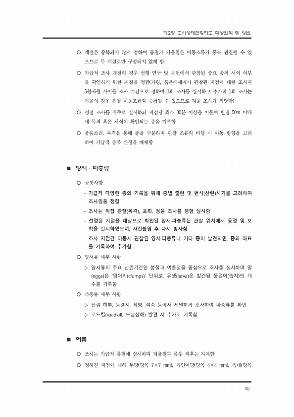 제2장 도시생태현황지도 작성원칙 및 방법 45 ¡ 계절은 중복되지 않게 정하며 봄철과 가을철은 이동조류가 중복 관찰될 수 있 으므로 두 계절로만 구성되지 않게 함 ¡ 가급적 조사 계절의 경우 선행 연구 및 문헌에서 관찰된 중요 종의 서식 여부 를 확인하기 위한 계절을 정함 가령, 붉은배새매가 관찰된 지점에 대한 조사지 5월6월 사이를 조사 기간으로 정하여 1회 조사를 실시하고 추가적 1회 조사는 가을의 경우 봄철 이동조류와 중첩될 수 있으므로 겨울 조사가 적당함 ¡ 정점 조사를 위주로 실시하되 지점당 최소 30분 이상을 머물며 반경 50m 이내 에 목격 혹은 서식이 확인되는 종을 기록함 ¡ 울음소리, 목격을 통해 종을 구분하며 관찰 조류의 비행 시 이동 방향을 고려 하여 가급적 중복 산정을 배제함 n 양서ㆍ...