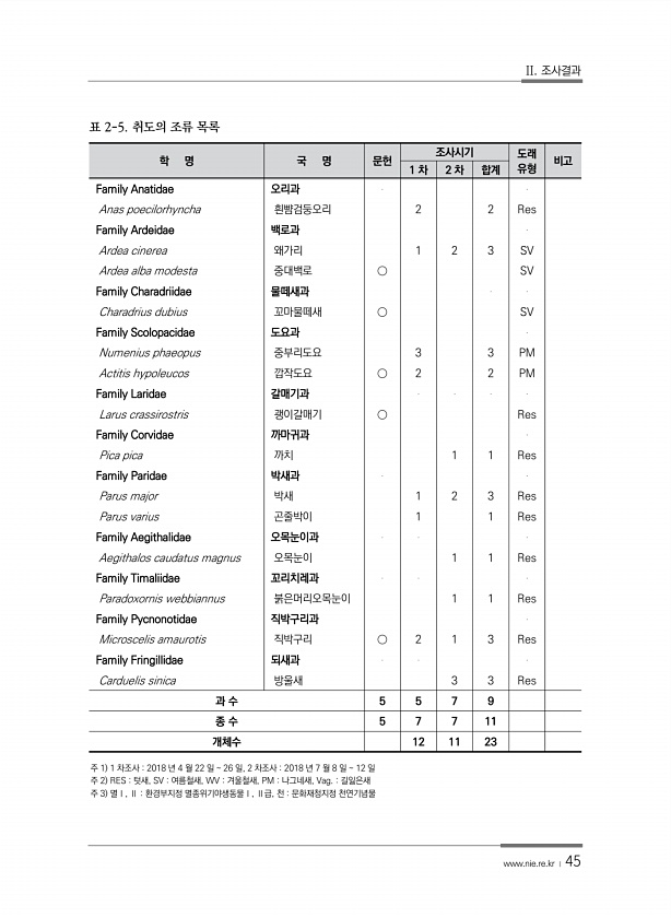 II. 조사결과 www.nie.re.kr ? 45 학 명 국 명 문헌 조사시기 도래 1 차 2 차 합계 유형 비고 Family Anatidae 오리과 Anas poecilorhyncha 흰뺨검둥오리 2 2 Res Family Ardeidae 백로과 Ardea cinerea 왜가리 1 2 3 SV Ardea alba modesta 중대백로 ○ SV Family Charadriidae 물떼새과 Charadrius dubius 꼬마물떼새 ○ SV Family Scolopacidae 도요과 Numenius phaeopus 중부리도요 3 3 PM Actitis hypoleucos 깝작도요 ○ 2 2 PM Family Laridae 갈매기과 Larus crassirostris 괭이갈매기 ○ Res Family Corv...
