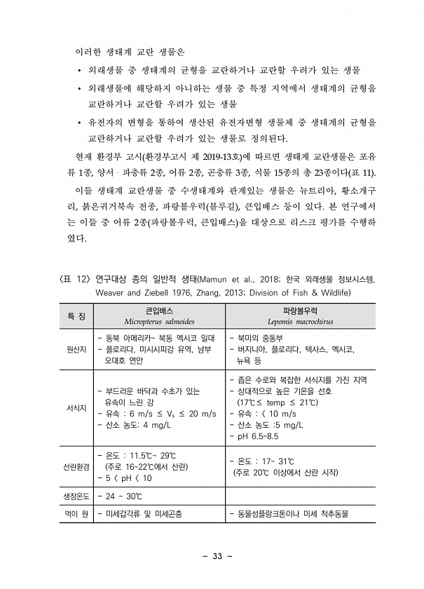 33 이러한 생태계 교란 생물은 ? 외래생물 중 생태계의 균형을 교란하거나 교란할 우려가 있는 생물 ? 외래생물에 해당하지 아니하는 생물 중 특정 지역에서 생태계의 균형을 교란하거나 교란할 우려가 있는 생물 ? 유전자의 변형을 통하여 생산된 유전자변형 생물체 중 생태계의 균형을 교란하거나 교란할 우려가 있는 생물로 정의된다. 현재 환경부 고시 환경부고시 제 2019-13호 에 따르면 생태계 교란생물은 포유 류 1종, 양서?파충류 2종, 어류 2종, 곤충류 3종, 식물 15종의 총 23종이다 표 11 이들 생태계 교란생물 중 수생태계와 관계있는 생물은 뉴트리아, 황소개구 리, 붉은귀거북속 전종, 파랑볼우럭 블루길 , 큰입배스 등이 있다. 본 연구에서 는 이들 중 어류 2종 파랑볼우럭, 큰입배스 을 대상으로 리...