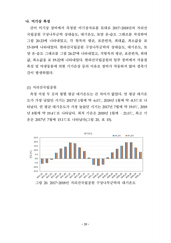 39 나. 미기상 특성 간이 미기상 장비에서 측정된 미기상자료를 토대로 20172018년의 지리산 국립공원 구상나무군락 상대습도, 대기온도, 토양 온 습도 그래프를 작성하여 그림 20-2V에 나타내었고, 각 항목의 평균, 표준편차, 최대값, 최소값을 표 15-18에 나타내었다. 한라산국립공원 구상나무군락의 상대습도, 대기온도, 토 양 온·습도 그래프를 그림 2U-27에 나타내었고, 각항목의 평균, 표준편차, 최대 값, 최소값을 표 1W-22에 나타내었다. 한라산국립공원의 일부 장비에서 겨울철 폭설 및 야생동물에 의한 기기손상 등의 이유로 장비가 작동하지 않아 결측기 간이 발생하였다. 1 지리산국립공원 측정 지점 두 곳의 월별 평균 대기온도는 큰 차이가 없었다. 연 평균 대기온 도가 가장 낮았던 시기는 201...